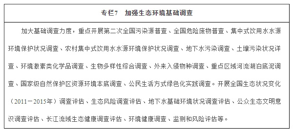 實施重點生態環保科技專項。繼續實施水體污染控制與治理國家科技重大專項,實施大氣污染成因與控制技術研究、典型脆弱生態修復與保護研究、煤炭清潔高效利用和新型節能技術研發、農業面源和重金屬污染農田綜合防治與修復技術研發、海洋環境安全保障等重點研發計劃專項。在京津冀地區、長江經濟帶、“一帶一路”沿線省(區、市)等重點區域開展環境污染防治和生態修復技術應用試點示范,提出生態環境治理系統性技術解決方案。打造京津冀等區域環境質量提升協同創新共同體,實施區域環境質量提升創新科技工程。創新青藏高原等生態屏障帶保護修復技術方法與治理模式,研發生態環境監測預警、生態修復、生物多樣性保護、生態保護紅線評估管理、生態廊道構建等關鍵技術,建立一批生態保護與修復科技示范區。支持生態、土壤、大氣、溫室氣體等環境監測預警網絡系統及關鍵技術裝備研發,支持生態環境突發事故監測預警及應急處置技術、遙感監測技術、數據分析與服務產品、高端環境監測儀器等研發。開展重點行業危險廢物污染特性與環境效應、危險廢物溯源及快速識別、全過程風險防控、信息化管理技術等領域研究,加快建立危險廢物技術規范體系。建立化學品環境與健康風險評估方法、程序和技術規范體系。加強生態環境管理決策支撐科學研究,開展多污染物協同控制、生態環境系統模擬、污染源解析、生態環境保護規劃、生態環境損害評估、網格化管理、綠色國內生產總值核算等技術方法研究應用。