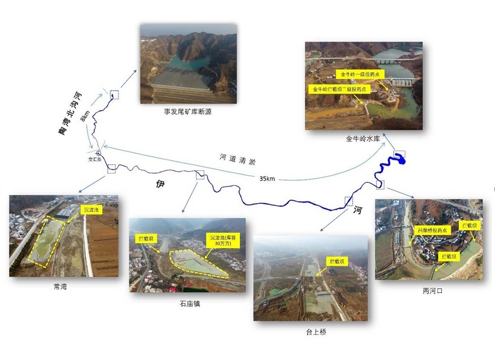 筑壩攔截。2月15日開始,欒川縣人民政府組織在伊河受影響的35公里干流河道分段設置攔截壩、開挖臨時沉淀池,在攔截污染水體、調節下泄流量、為投藥降污創造有利條件等方面發揮重要作用。
